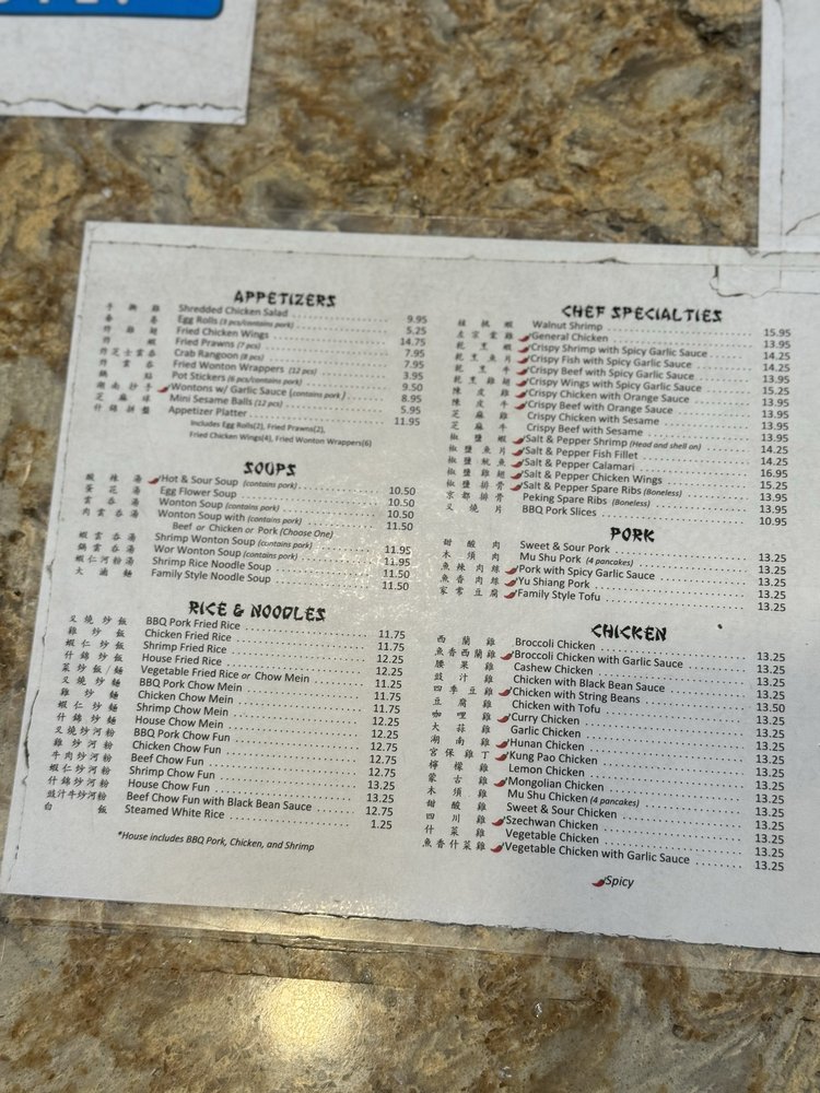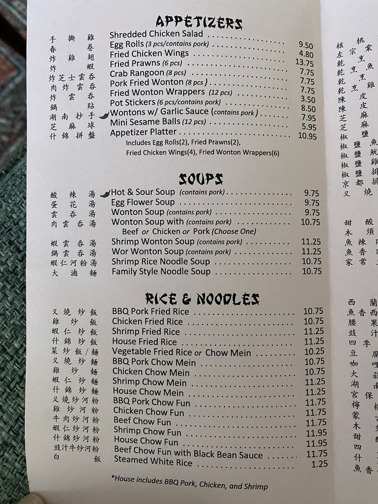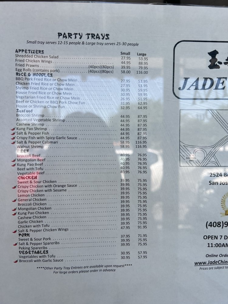 Introducing the menu at Jade China, located in San Jose, CA, offers a variety of appetizers like Fried Prawns and Crab Rangoon. Their Soups include Hot & Sour Soup and Wonton Soup, while Rice & Noodle options range from BBQ Pork Fried Rice to Vegetable Chow Mein. Customers rave about the quality of the food, with standout dishes like calamari and walnut shrimp. The service is praised for its speed and efficiency, making it a great spot for large parties and family-style dining. The portion sizes are generous, with customers recommending the Chow Fun, Mongolian beef, and fried prawns. Overall, Jade China is described as a must-visit for comfort Chinese food, offering delicious options like salt & pepper wings and fish that stand out at any gathering. The restaurant's convenient location, ample parking, and reasonable prices make it a popular choice for both dine-in and takeout orders.
